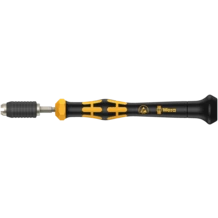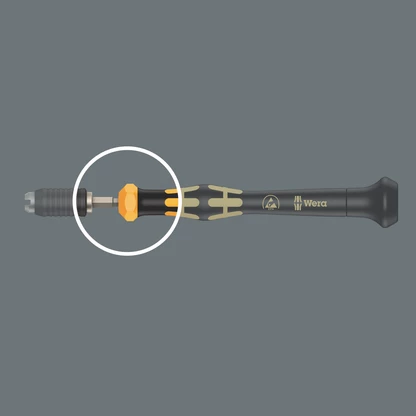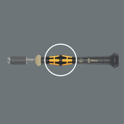 Con un par dinamométrico fijamente preajustado de fábrica en el menor valor de la escala. Adecuado para todas aquellas aplicaciones en las cuales es necesario que se tenga un valor del par constantemente igual y en los que se requiera una alta exactitud repetitiva. Dispone de un sistema compacto de mango y varillas intercambiables para permitir unos trabajos de precisión en uniones atornilladas que requieren un control dinamométrico. El destornillador dinamométrico Kraftform Micro ESD es ideal para trabajos en uniones atornilladas con control dinamométrico en componentes con un riesgo electrostático. Es adecuado para puntas con arrastre de tipo Halfmoon de 4 mm (serie de Wera 9) y de tipo HIOS de 4 mm (serie de Wera 21). Dispone de una protección contra manipulaciones. Al alcanzar el par de giro preajustado se escucha y se palpa un sobreencastre de manera clara. La exactitud repetitiva está garantizada en un 100 %. El par de desapriete manual es ilimitado. La resistencia superficial es de ≤ 109 ohmios para ofrecer una protección segura contra energía electrostática. Ha sido elaborado según la norma DIN EN 61340-5-1. El sistema de mangos y varillas intercambiables permite un cambio ultrarrápido de las varillas. El mango es tipo Kraftform Micro y dispone de una caperuza giratoria así como de una zona de giro rápido lo cual permite un movimiento de giro sumamente veloz sin tener que cambiar de agarre lo cual ahorra mucho tiempo. Se dispone de una zona de potencia con zonas blandas integradas para permitir una transmisión muy alta de los pares de apriete y desapriete. Directamente por encima de la varilla se encuentra una zona de precisión para lograr el ángulo correcto de giro durante trabajos de ajuste. Las puntas se pueden fijar de una manera superrápida: simplemente se ha de montar la punta en la toma del útil, luego el autobloqueo funciona autónomamente, y la punta queda posicionada de manera segura en su lugar. Para cambiar la punta, simplemente se ha de mover el casquillo hacia adelante y luego se puede extraer la punta. El casquillo de marcha libre permite una guía muy fácil de la herramienta durante el trabajo de atornillar. Las puntas son adecuadas para trabajos tanto manuales como mecánicos en atornilladoras eléctricas (entre otras de HIOS, Delvo, Sehan). El destornillador es adecuado para trabajos en, por ejemplo, smartphones, teléfonos móviles, cámaras y aparatos electrónicos, así como en laboratorios dentales y consultorios odontológicos.