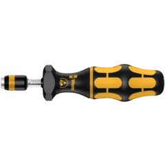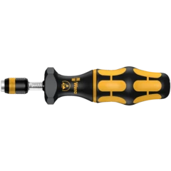 Destornillador dinamométrico de Wera. Con un valor de escala del par dinamométrico fijamente preajustado de fábrica en el menor valor de la escala. Adecuado para todas aquellas aplicaciones en las cuales es necesario que se tenga un valor del par constantemente igual y en los que se requiera una alta exactitud repetitiva.