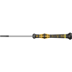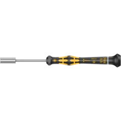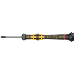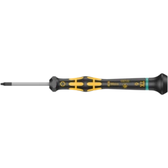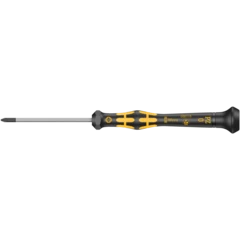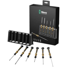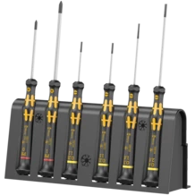 Juego de destornilladores Micro de Wera con protección anti-electroestática. Una protección segura contra energía electroestática y los daños que ésta puede conllevar. Por medio del apoyo de la mano en el sombrerete giratorio y gracias a la zona de giro rápido situada por debajo del sombrerete giratorio, se consigue un movimiento de retorcimiento ultrarrápido. Se gana tiempo al no tener que cambiar de agarre una y otra vez. La zona de potencia con las zonas blandas que lleva integradas permite la transmisión de pares altos de desapriete y apriete. Con zona de precisión para el ángulo de giro correcto en trabajos de ajuste. La punta Black Point ofrece gran exactitud de posicionamiento y una protección anticorrosiva optimizada.