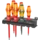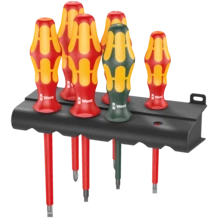 Juego de destornilladores de 6 piezas con destornilladores aislados, probados pieza por pieza según IEC 60900. La prueba individual se realiza en un baño de agua a 10.000 V para poder garantizar un trabajo seguro a una tensión permitida de 1.000 V. El mango es tipo Kraftform Plus para un trabajo agradable y ergonómico sin que se produzcan ampollas o callosidades. Las zonas duras de agarre permiten una gran velocidad de trabajo mientras que las zonas blandas de agarre garantizan la transmisión de altos pares de giro.En parte llevan Lasertip: la punta se aferra fuertemente a la cabeza del tornillo y evita así que el útil involuntariamente se desprenda del tornillo por deslizamiento. Con sistema de búsqueda de herramienta Take it easy: marcas de color según el perfil y sellos con el tamaño. El sistema de protección contra el rodamiento evita las molestias que conlleva el perder la herramienta que se rueda en el puesto de trabajo. Incluye 1 bandeja para depositar los útiles.