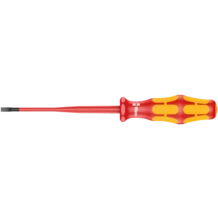 Destornillador aislado VDE de ranura de Wera con diámetro de varilla y mango reducidos, también para acceder a tornillos situados profundamente y en entornos estrechos. Con mango multicomponente Kraftform Plus para un trabajo rápido y ergonómico: las zonas duras de agarre permiten una gran velocidad de trabajo mientras que las zonas blandas de agarre garantizan la transmisión de altos pares de giro. Se realizan pruebas individuales a 10.000 V para poder garantizar un trabajo seguro bajo la tensión permitida de 1.000 V. Sistema de búsqueda de herramienta "Take it easy" con marcas de color según perfiles y marcado del tamaño - para encontrar la herramienta precisa de forma más fácil y rápida. El sistema de protección contra el rodamiento mediante hexágono evita las molestias que conlleva el perder la herramienta que se rueda en el puesto de trabajo.