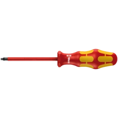 Destornillador VDE de Wera con mango multicomponente Kraftform para un trabajo rápido y ergonómico: las zonas duras de agarre permiten una gran velocidad de trabajo mientras que las zonas blandas de agarre garantizan la transmisión de altos pares de giro. Se realizan pruebas individuales a 10.000 V para poder garantizar un trabajo seguro bajo la tensión permitida de 1.000 V. Sistema de búsqueda de herramienta "Take it easy" con marcas de color según perfiles y marcado del tamaño - para encontrar la herramienta precisa de forma más fácil y rápida. El sistema de protección contra el rodamiento mediante hexágono evita las molestias que conlleva el perder la herramienta que se rueda en el puesto de trabajo.