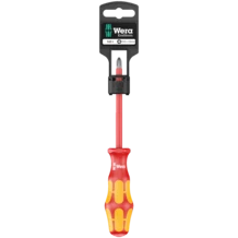 Destornillador VDE de Wera con mango multicomponente Kraftform para un trabajo rápido y ergonómico: las zonas duras de agarre permiten una gran velocidad de trabajo mientras que las zonas blandas de agarre garantizan la transmisión de altos pares de giro. Han sido probados pieza por pieza en un baño de agua a 10.000 V para poder garantizar un trabajo seguro bajo la tensión permitida de 1.000 V. La punta de los destornilladores Lasertip de Wera recibe un tratamiento de lijado microscópicamente fino con ayuda de rayos láser. Esta superficie rugosa se aferra fuertemente a la cabeza del tornillo. Así, ya no es posible que el útil involuntariamente se desprenda del tornillo por deslizamiento. Sistema de búsqueda de herramienta "Take it easy" con marcas de color según perfiles y marcado del tamaño - para encontrar la herramienta precisa de forma más fácil y rápida. El sistema de protección contra el rodamiento mediante hexágono evita las molestias que conlleva el perder la herramienta que se rueda en el puesto de trabajo.