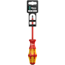 Destornillador VDE de Wera con mango multicomponente Kraftform Plus para un trabajo rápido y ergonómico: las zonas duras de agarre permiten una gran velocidad de trabajo mientras que las zonas blandas de agarre garantizan la transmisión de altos pares de giro. Han sido probados pieza por pieza en un baño de agua a 10.000 V para poder garantizar un trabajo seguro bajo la tensión permitida de 1.000 V. Sistema de búsqueda de herramienta "Take it easy" con marcas de color según perfiles y marcado del tamaño - para encontrar la herramienta precisa de forma más fácil y rápida. El sistema de protección contra el rodamiento mediante hexágono evita las molestias que conlleva el perder la herramienta que se rueda en el puesto de trabajo.