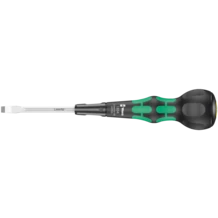 Destornillador con mango Kraftform Serie 1800 para tornillos de ranura. El mango se adapta de manera excelente a la mano. La forma de bola permite la transmisión de unos pares de giro muy altos. Las zonas blandas de agarre del mango proporcionan una sensación háptica agradable y segura, y además evitan mayores pérdidas en la transmisión de la fuerza. Las zonas duras de agarre permiten una alta transmisión de la fuerza, incluso cuando se ejerce presión con la palma de la mano. Las cavidades de agarre para los dedos que se encuentran en el extremo superior del mango facilitan los ajustes delicados durante los trabajos en uniones atornilladas. Gracias a la zona de unión delgada entre el mango y la varilla, también es posible alcanzar tornillos difícilmente accesibles que se encuentran a profundidad o en entornos de montaje muy estrechos. El sistema antirrodamiento en el extremo superior del útil evita las molestias que pueden ocurrir cuando la herramienta se rueda en el puesto de trabajo. El extremo de la varilla de los destornilladores Wera Lasertip ha sido tratado con rayos Laser para conseguir una rugosidad microscópicamente fina. Esta superficie rugosa prácticamente se aferra fuertemente en la cabeza del tornillo como si tuviera dientes. Así se evita que el útil se desprenda de forma involuntaria deslizándose del tornillo.