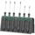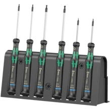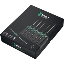 Juego de destornilladores Wera Micro de alta calidad para uniones atornilladas de mecánica de precisión. Perfil de cabeza esférica: gracias a los perfiles esféricos de salida es posible desviar o girar el eje de la herramienta hacia el eje del tornillo. De esta forma se pueden realizar trabajos de atornillar "doblando la esquina". Por medio del apoyo de la mano en el sombrerete giratorio, y gracias a la zona de giro rápido situada por debajo del sombrerete giratorio, se consigue un movimiento de retorcimiento ultrarrápido. Se gana tiempo al no tener que cambiar de agarre una y otra vez. La zona de potencia con las zonas blandas que lleva integradas permite la transmisión de pares altos de desapriete y apriete. La zona de precisión sirve para el ángulo de giro correcto en trabajos de ajuste. La punta Black Point ofrece gran exactitud de posicionamiento y una protección anticorrosiva optimizada.