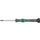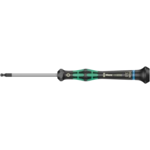 Destornillador Wera Micro de alta calidad para uniones atornilladas de mecánica de precisión. Perfil de cabeza esférica: gracias a los perfiles esféricos de salida es posible desviar o girar el eje de la herramienta hacia el eje del tornillo. De esta forma se pueden realizar trabajos de atornillar "doblando la esquina". Por medio del apoyo de la mano en el sombrerete giratorio, y gracias a la zona de giro rápido situada por debajo del sombrerete giratorio, se consigue un movimiento de retorcimiento ultrarrápido. Se gana tiempo al no tener que cambiar de agarre una y otra vez. La zona de potencia con las zonas blandas que lleva integradas permite la transmisión de pares altos de desapriete y apriete. La zona de precisión sirve para el ángulo de giro correcto en trabajos de ajuste. La punta Black Point ofrece gran exactitud de posicionamiento y una protección anticorrosiva optimizada. Sistema de búsqueda de herramienta "Take it easy" con marcas de color según perfiles y marcado del tamaño - para encontrar la herramienta precisa de forma más fácil y rápida.