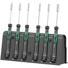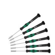 Juego de destornilladores aprieta-tuercas Wera Micro de alta calidad para uniones atornilladas de mecánica de precisión. Por medio del apoyo de la mano en el sombrerete giratorio, y gracias a la zona de giro rápido situada por debajo del sombrerete giratorio, se consigue un movimiento de retorcimiento ultrarrápido. Se gana tiempo al no tener que cambiar de agarre una y otra vez. La zona de potencia con las zonas blandas que lleva integradas permite la transmisión de pares altos de desapriete y apriete. La zona de precisión sirve para el ángulo de giro correcto en trabajos de ajuste. Incluye una bandeja práctica para el alojamiento ordenado y sistemático de los destornilladores.