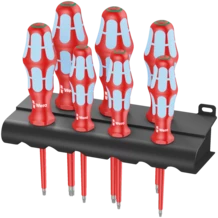 Juego de destornilladores VDE de 7 piezas de acero inoxidable. Las herramientas de acero inoxidable de Wera se endurecen al vacío con hielo y, por tanto, disponen de la dureza y resistencia necesarias para el atornillado. El uso industrial es posible sin restricciones. Las pruebas rutinarias de los destornilladores VDE Kraftform Inoxidable a 10.000 voltios según la norma DIN EN 60900 (IEC 60900) garantizan un trabajo seguro hasta 1.000 voltios. Incluso en condiciones extremas de trabajo, la seguridad está garantizada por la probada de resistencia a -40 °C. Mango Kraftform multicomponente para un trabajo rápido y suave. Sistema de búsqueda Take it easy con codificación de colores según los perfiles y marcado del tamaño, para encontrar la herramienta necesaria de forma rápida y sencilla. La protección anti-rodamiento hexagonal evita que la herramienta se vaya rodando.