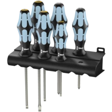 Juego de destornilladores de alta calidad Kraftform Plus de acero inoxidable de Wera. Las herramientas de acero inoxidable de Wera se elaboran con ayuda del método de endurecimiento de congelación al vacío y disponen así de los valores de dureza y resistencia que se necesitan para uniones atornilladas. La aplicación industrial es posible sin ninguna clase de limitaciones. En su mayor parte llevan Lasertip: la punta se aferra fuertemente a la cabeza del tornillo y evita así que el útil se desprenda del tornillo por deslizamiento. El mango es tipo Kraftform multicomponente para un trabajo agradable y ergonómico. Sistema de búsqueda de herramienta "Take it easy" con marcas de color según perfiles y marcado del tamaño - para encontrar la herramienta precisa de forma más fácil y rápida. El sistema de protección contra el rodamiento evita las molestias que conlleva el perder la herramienta que se rueda en el puesto de trabajo. Incluye la bandeja práctica para depositar los destornilladores de forma sistemática.