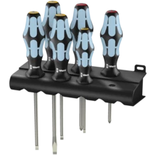 Juego de destornilladores de alta calidad Kraftform Plus de acero inoxidable de Wera. Las herramientas de acero inoxidable de Wera se elaboran con ayuda del método de endurecimiento de congelación al vacío y disponen así de los valores de dureza y resistencia que se necesitan para uniones atornilladas. La aplicación industrial es posible sin ninguna clase de limitaciones. En su mayor parte llevan Lasertip: la punta se aferra fuertemente a la cabeza del tornillo y evita así que el útil se desprenda del tornillo por deslizamiento. El mango es tipo Kraftform multicomponente para un trabajo agradable y ergonómico. Sistema de búsqueda de herramienta "Take it easy" con marcas de color según perfiles y marcado del tamaño - para encontrar la herramienta precisa de forma más fácil y rápida. El sistema de protección contra el rodamiento evita las molestias que conlleva el perder la herramienta que se rueda en el puesto de trabajo. Incluye la bandeja práctica para depositar los destornilladores de forma sistemática.