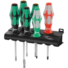 Juego de destornilladores de 6 piezas con mango Kraftform Plus que permite un trabajo agradable y ergonómico sin que se formen ampollas o callosidades. Las zonas duras de agarre permiten una gran velocidad de trabajo mientras que las zonas blandas de agarre garantizan la transmisión de altos pares de giro. En parte llevan Lasertip: La punta Lasertip se aferra fuertemente a la cabeza del tornillo y evita así que involuntariamente ocurra un deslizamiento del útil. Con sistema de búsqueda de herramienta Take it easy: marcas de color según el perfil y sellos con el tamaño. El sistema de protección contra el rodamiento mediante hexágono evita las molestias que conlleva el perder la herramienta que se rueda en el puesto de trabajo.