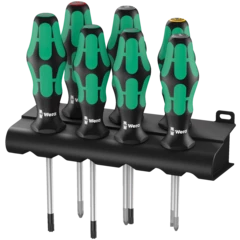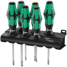 Juego de destornilladores de 6 piezas con mango Kraftform Plus que permite un trabajo agradable y ergonómico sin que se formen ampollas o callosidades. Las zonas duras de agarre permiten una gran velocidad de trabajo mientras que las zonas blandas de agarre garantizan la transmisión de altos pares de giro. La punta Lasertip se aferra fuertemente a la cabeza del tornillo y evita así que involuntariamente ocurra un deslizamiento del útil. Con sistema de búsqueda de herramienta Take it easy: marcas de color según el perfil y sellos con el tamaño. El sistema de protección contra el rodamiento mediante hexágono evita las molestias que conlleva el perder la herramienta que se rueda en el puesto de trabajo. Incluye una bandeja práctica para depositar los destornilladores de forma sistemática y ordenada.