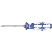 Destornillador Kraftform Plus de Wera de alta calidad. Con zonas duras de agarre para una gran velocidad de trabajo y zonas blandas de agarre para la transmisión de altos pares de giro: así se consigue un trabajo rápido y ergonómico. La punta de los destornilladores Lasertip de Wera recibe un tratamiento de lijado microscópicamente fino con ayuda de rayos láser. Esta superficie rugosa se aferra fuertemente a la cabeza del tornillo. Así, ya no es posible que el útil involuntariamente se desprenda del tornillo por deslizamiento. Gracias a la varilla hexagonal así como a la llave auxiliar hexagonal integrada, y con ayuda de llaves de boca o anillo, es posible transmitir unos pares de giro mayores. Sistema de búsqueda de herramienta "Take it easy" con marcas de color según perfiles y marcado del tamaño - para encontrar la herramienta precisa de forma más fácil y rápida. El sistema de protección contra el rodamiento mediante hexágono evita las molestias que conlleva el perder la herramienta que se rueda en el puesto de trabajo.