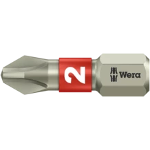 Puntas de alta calidad de acero inoxidable para tornillos de ranura en cruz. Las herramientas de acero inoxidable de Wera se elaboran de acero inoxidable, y así se evita la formación de la la herrumbre de origen externo que tiene un aspecto tan desagradable. Con zona de torsión: en el caso de las puntas de torsión, los picos del par de giro son amortiguados dentro de la zona de torsión. Así se evita un desgaste prematuro y se aumenta la longevidad de la punta. Hexagonal de 1/4", adecuado para porta-puntas según la norma DIN ISO 1173-D 6,3.
