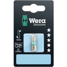 Puntas de alta calidad de acero inoxidable para tornillos de TORX® interior. Las herramientas de acero inoxidable de Wera se elaboran de acero inoxidable, y así se evita la formación de la herrumbre de origen externo que tiene un aspecto tan desagradable. Con zona de torsión: en el caso de las puntas de torsión, los picos del par de giro son amortiguados dentro de la zona de torsión. Así se evita un desgaste prematuro y se aumenta la longevidad de la punta. Hexagonal de 1/4", adecuado para porta-puntas según la norma DIN ISO 1173-D 6,3.