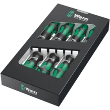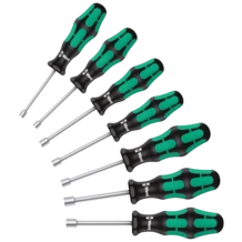 Juego de Aprieta-Tuercas de 7 piezas de Wera. Con vástago hueco para atornillar varillas de rosca, porque sólo así la varilla de rosca puede penetrar por medio de la tuerca al vástago hueco del destornillador. Con un mango multicomponente Kraftform para unas velocidades de trabajo mayores y un trabajo especialmente ergonómico. Con sistema de protección por hexagonal contra el rodamiento del útil. Lleva la marcación correspondiente en el mango para encontrar y clasificar los útiles más fácilmente. Para tornillos de hexágono exterior.