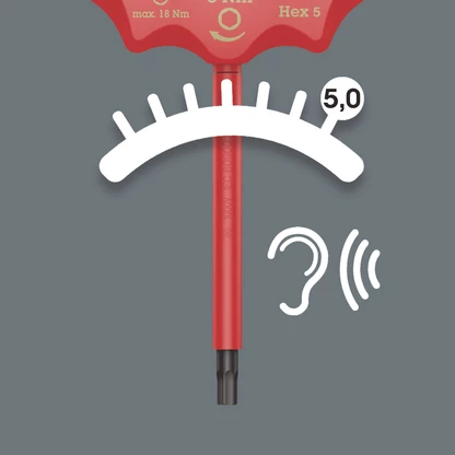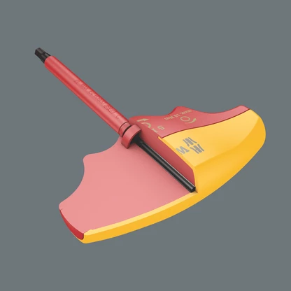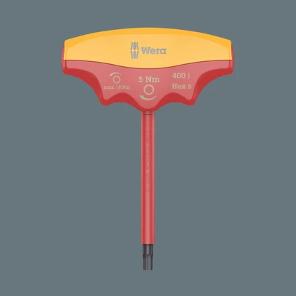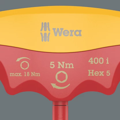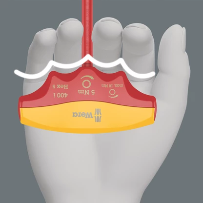 "Destorpar" VDE de Wera con par de apriete fijo para tornillos de hexágono interior. Protegido contra manipulaciones. El robusto acoplamiento a fricción emite una señal de salto claramente audible y palpable cuando se alcanza el par de giro preajustado. Ahora, exceder el apriete más allá del par ajustado ya no es posible. El par de aflojado es siempre mayor que el par de apriete ajustado. De esta forma, en la mayoría de los casos no se necesitan otras herramientas adicionales para aflojar uniones atornilladas. La forma del mango de esta herramienta ocupa completamente toda la mano, y los dedos se alojan suavemente dentro de las molduras redondeadas. De esta forma se garantiza una transmisión de la fuerza óptima y de forma ergonómica. Es una herramienta probada en un 100 %, pieza por pieza, según la norma IEC 60900, a 10.000 voltios para un trabajo seguro bajo la tensión permitida de 1.000 voltios.