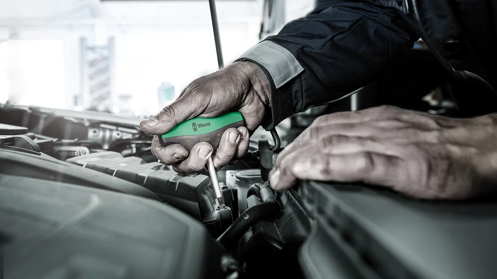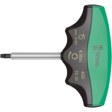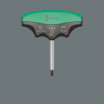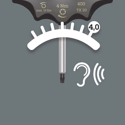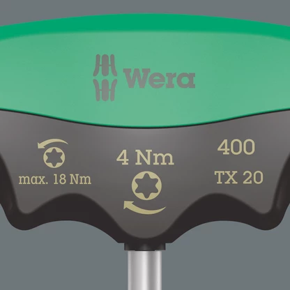 "Destorpar" Wera con valor de apriete fijo para tornillos TORX®. Protegido contra manipulaciones. El robusto acoplamiento a fricción emite una señal de salto claramente audible y palpable cuando se alcanza el par de giro preajustado. Ahora, exceder el apriete más allá del par ajustado ya no es posible. El par de aflojado es siempre mayor que el par de apriete ajustado. De esta forma, en la mayoría de los casos no se necesitan otras herramientas adicionales para aflojar uniones atornilladas. La forma del mango de esta herramienta ocupa completamente toda la mano, y los dedos se alojan suavemente dentro de las molduras redondeadas. De esta forma se garantiza una transmisión de la fuerza óptima y de forma ergonómica.