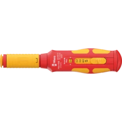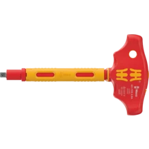Mango en T VDE aislado con toma de cuadradillo de 1/4" y un bloqueo por bola integrado para herramientas de conexión. El mecanismo de carraca integrado en el mango con su dentado fino permite un trabajo rápido y enérgico. Las hendiduras en el manguito de giro libre permiten crear una resistencia por medio de la fuerza de los dedos. Esto permite utilizar el mecanismo de carraca incluso en casos de poca resistencia al atornillar. La forma del mango en T permite la transmisión de pares de apriete y desapriete especialmente altos. La geometría del mango rellena toda la mano de forma completa, y los dedos se apoyan de manera segura dentro de las molduras suavemente redondeadas del mango. De esta forma se garantiza una transmisión de la fuerza óptima y ergonómica. El útil ha sido probado en un 100 % según IEC 60900 a 10.000 voltios para garantizar un trabajo seguro a una tensión permitida de 1.000 voltios. Para llaves de punta VDE y llaves de vaso VDE de 1/4" de las series Wera Zyklop VDE 8740, 8760, 8767, 8790. El mango está revestido con una camisa, y protege así las superficies - incluso superficies delicadas - ante posibles daños que pudieran ocurrir.