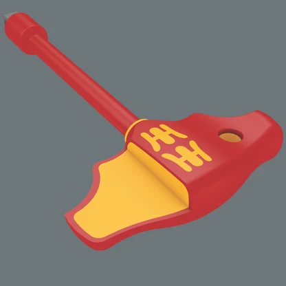 La forma del mango en "T" permite la transmisión de pares de apriete y desapriete especialmente altos. La geometría ergonómica del mango rellena toda la mano de forma completa, y los dedos se alojan fijamente en los encajes suavemente redondeados del mango. Así se garantiza una transmisión de la fuerza óptima y ergonómica. La herramienta ha sido probada en un 100 % según IEC 60900 a 10.000 voltios para un trabajo seguro bajo la tensión máxima permitida de 1.000 voltios. Solo se permite para el uso con vasos de punta VDE de 3/8" y llaves de vaso de las series Wera Zyklop VDE 8740, 8760, 8767, 8790. El mango lleva un forro que protege incluso las superficies delicadas ante posibles daños.