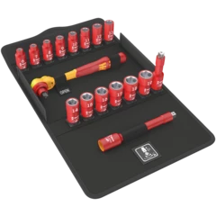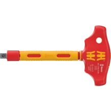 Mango en T VDE aislado con toma de cuadradillo de 3/8" y un bloqueo por bola integrado para herramientas de conexión. El mecanismo de carraca integrado en el mango con su dentado fino permite un trabajo rápido y enérgico. Las hendiduras en el manguito de giro libre permiten crear una resistencia por medio de la fuerza de los dedos. Esto permite utilizar el mecanismo de carraca incluso en casos de poca resistencia al atornillar. La forma del mango en T permite la transmisión de pares de apriete y desapriete especialmente altos. La geometría del mango rellena toda la mano de forma completa, y los dedos se apoyan de manera segura dentro de las molduras suavemente redondeadas del mango. De esta forma se garantiza una transmisión de la fuerza óptima y ergonómica. El útil ha sido probado en un 100 % según IEC 60900 a 10.000 voltios para un trabajo seguro a una tensión permitida de 1.000 voltios. Para llaves de punta y llaves de vaso VDE de 3/8" de las series Wera Zyklop VDE 8740, 8760, 8767, 8790. El mango está revestido con una camisa, y protege así las superficies - incluso superficies delicadas - ante posibles daños que pudieran ocurrir.