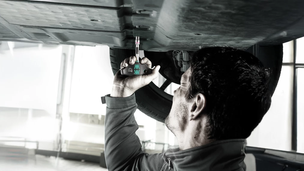 La carraca integrada con dentado fino (80 dientes/ángulo de retorno de 4,5°) facilita y acelera el trabajo en uniones atornilladas y evita las molestias de tener que reposicionar el útil constantemente. El mecanismo de carraca que está integrado de forma completa en el mango, permite un trabajo sumamente práctico y agradable. Con una palanca de conmutación para realizar el cambio de giro derecha/izquierda cómodamente con una sola mano. La forma ergonómica del mango rellena toda la palma de la mano, los dedos se encuentran ubicados de manera segura en las cavidades suavemente redondeadas del mango. Así toda la mano entra en contacto con el mango y se evitan las pérdidas por fricción entre mano y mango. Toma de vasos de ¼" con un bloqueo seguro.