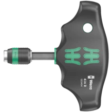 Destornillador de mango en "T": La forma ideal del agarre permite la transmisión de pares de apriete y desapriete especialmente altos. La forma ergonómica del mango rellena la palma de la mano de forma perfecta, los dedos de la mano se depositan de forma segura en las cavidades del mango. Así, toda la mano se encuentra en contacto con el mango y de esta manera se evitan pérdidas friccionales entre la mano y el mango. Porta-puntas para puntas de arrastre exterior de 1/4" según la norma DIN ISO 1173-C 6,3 y E 6,3. Con la tecnología Rapidaptor para un cambio ultrarrápido de las puntas.