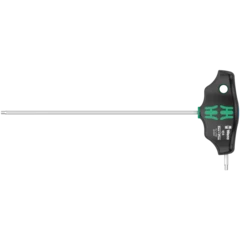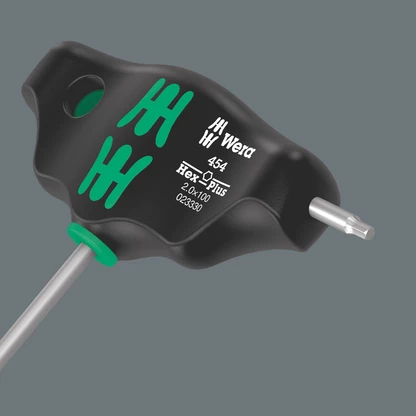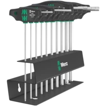 Destornillador con mango en T: la forma ideal del mango permite la transmisión de pares de apriete y desapriete especialmente altos. La forma ergonómica del mango rellena la palma de la mano de manera completa, los dedos se alojan de forma segura en los encajes redondeados y suaves. Toda la mano entra en contacto con el mango, y así se evitan pérdidas de fricción entre la mano y el mango. Incluye un sistema de retención para sostener el tornillo hexagonal de forma segura en la herramienta. La superficie ha sido tratada de forma especial para que se obtenga una alta protección anticorrosiva y una gran exactitud de ajuste dentro del tornillo. Incluye un soporte metálico para el alojamiento de los útiles. Este soporte se puede colocar encima del banco de trabajo, o colgar en la pared de las herramientas.