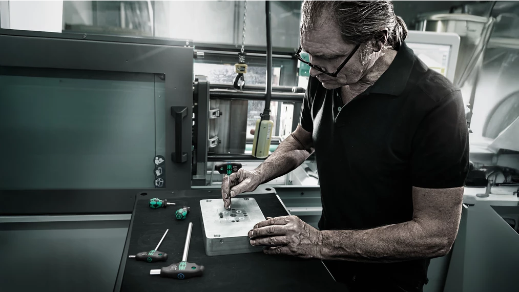 El aprisionamiento del tornillo hexagonal interior en el extremo de la herramienta se garantiza por medio de una bola elástica. Esto es especialmente útil en aquellos casos en los cuales se trabaja en entornos de montaje de acceso difícil donde no es posible utilizar la otra mano para sostener el tornillo.