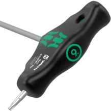 Destornillador de mango en T: la forma ideal del mango permite la transmisión de pares de apriete y desapriete especialmente altos. La forma ergonómica del mango rellena toda la palma de la mano, los dedos se encuentran ubicados de manera segura en las cavidades suavemente redondeadas del mango. Así toda la mano entra en contacto con el mango y se evitan las pérdidas por fricción entre mano y mango. Con función de sujeción para un sostenimiento seguro del tornillo TORX® en la herramienta. La bonificación especial de la superficie del útil ofrece una alta protección anticorrosiva y una exactitud de encaje óptima del tornillo.