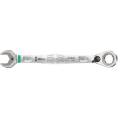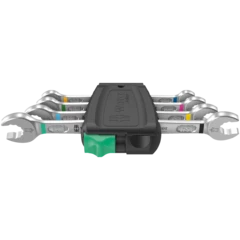 Juego de llaves combinadas con carraca de Wera, de alta calidad: todo lo que ha de saber hacer una llave. Y mucho más aún. Más rápida, mucho mejor y mucho más bella. O sea, una Joker, un verdadero "comodín". Es la nueva generación de las llaves carraca de boca y anillo. Un juego de 6 piezas en un bolso robusto. 4 llaves con extremo de boca y extremo de carraca, cada uno con el mismo tamaño de llave. 2 llaves con boca en ambos extremos en diferentes tamaños de llave. Adecuadas para cabezas de tornillos o tuercas hexagonales. Con la función de retención mediante la placa metálica en la boca que reduce el riesgo de que se pierda el tornillo o la tuerca. La placa metálica intercambiable que se encuentra montada en la boca asegura los tornillos y las tuercas por medio de sus dientes extraduros y reduce así el ríesgo de un resbalamiento. El tope final integrado es capaz de evitar que la cabeza del tornillo se deslice hacia abajo, y permite así que se apliquen pares de giro mayores. La geometría de doble hexágono permite una conexión en unión continua con el tornillo o la tuerca, y reduce así el peligro de un deslizamiento. Un ángulo de recuperación de tan sólo 30° al lado de la boca evita pérdidas de tiempo al no tener que darle la vuelta a la llave una y otra vez al atornillar. El sistema mecánico de la carraca al lado del anillo dispone de un dentado fino extraordinariamente alto de 80 dientes lo que permite una enorme flexibilidad incluso en ambientes de montaje muy estrechos. La geometría especial de forja produce altas transmisiones del par de giro y una enorme rigidez flexional. Se elabora de un acero de cromo-molibdeno de alto rendimiento con una capa de níquel-cromo para ofrecer una mayor protección antiocorrosiva. Con sistema de búsqueda de herramienta Take it easy: marcas de color según el tamaño.