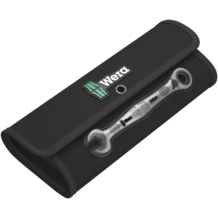 Juego de llaves combinadas con carraca de Wera, de alta calidad: todo lo que ha de saber hacer una llave. Y mucho más aún. Más rápida, mucho mejor y mucho más bella. O sea, una Joker, un verdadero "comodín". Es la nueva generación de las llaves carraca de boca y anillo. Un juego de 4 piezas en un bolso robusto. Adecuadas para cabezas de tornillos o tuercas hexagonales. Con la función de retención mediante la placa metálica en la boca que reduce el riesgo de que se pierda el tornillo o la tuerca. La placa metálica intercambiable que se encuentra montada en la boca asegura los tornillos y las tuercas por medio de sus dientes extraduros y reduce así el ríesgo de un resbalamiento. El tope final integrado es capaz de evitar que la cabeza del tornillo se deslice hacia abajo, y permite así que se apliquen pares de giro mayores. La geometría de doble hexágono permite una conexión en unión continua con el tornillo o la tuerca, y reduce así el peligro de un deslizamiento. Un ángulo de recuperación de tan sólo 30° al lado de la boca evita pérdidas de tiempo al no tener que darle la vuelta a la llave una y otra vez al atornillar. El sistema mecánico de la carraca al lado del anillo dispone de un dentado fino extraordinariamente alto de 80 dientes lo que permite una enorme flexibilidad incluso en ambientes de montaje muy estrechos. La geometría especial de forja produce altas transmisiones del par de giro y una enorme rigidez flexional. Se elabora de un acero de cromo-molibdeno de alto rendimiento con una capa de níquel-cromo para disponer de una mayor protección antiocorrosiva. Con sistema de búsqueda de herramienta Take it easy: marcas de color según el tamaño.