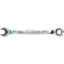 Llave carraca de boca y anillo Joker con dobladura al lado de la carraca así como con palanca de conmutación. Con función de retención gracias a la placa metálica en la boca que reduce el riesgo de que se pierdan tornillos o tuercas. El tope final integrado es capaz de evitar el deslizamiento de la cabeza del tornillo hacia abajo y permite aplicar altos pares de giro. Con sus dientes extra-duros, la placa metálica intercambiable en la boca asegura los tornillos y las tuercas, y reduce así el riesgo de resbalamiento. La geometría de doble hexágono permite una unión completa con el tornillo o la tuerca y contribuye de esta forma igualmente a reducir el riesgo de deslizamientos. El pequeño ángulo de retorno de tan sólo 30° al lado de la boca evita el tener que darle la vuelta a la llave durante los trabajos de atornillar, y así ayuda a ahorrar tiempo. El mecanismo de carraca conmutable al lado del anillo con la dentadura fina de 80 dientes, permite una gran flexibilidad, también en espacios estrechos. El mecanismo de carraca es audiblemente preciso. Además, el elemento de encastramiento de dos piezas proporciona una enorme estabilidad y firmeza. El lado de la carraca con su dobladura en 15° permite un trabajo seguro en altos pares de giro. La geometría de forja especial permite la transmisión de altos pares y ofrece gran rigidez torsional. Se elabora en acero de cromo-molibdenio de gran eficiencia y dispone de una capa de níquel y cromo para una mayor protección anticorrosiva. Lleva el sistema de búsqueda fácil de herramienta Take it easy: se dispone de una marcación de la herramienta según el tamaño.