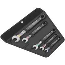 Por el hecho de que en los trabajos de uniones atornilladas los espacios de montaje son cada vez más estrechos es necesario que los usuarios dispongan de herramientas con las cuales también puedan trabajar de forma exitosa en estas situaciones. En entornos estrechos se necesitan puntos adicionales en los cuales se pueda reposicionar la herramienta. ¿Entonces, será posible modificar las llaves de boca de tal manera que aumenten las posibilidades de reposicionamiento de la herramienta? Por medio de la combinación de la boca que se encuentra girada en un ángulo de 7,5° y la geometría del doble hexágono, se logra una duplicación de los puntos de posicionamiento de la herramienta al atornillar. Al girar la llave de forma repetida en 180° por su eje longitudinal durante la acción de atornillar se dan cuatro posibilidades, y así las tuercas y los tornillos pueden accionarse cada 15°. De esta forma, la Joker 6003 con su geometría de boca tan ingeniosa amplía el espectro de aplicaciones en espacios estrechos de una manera importante. La Joker 6003 prácticamente encuentra el punto correspondiente de posicionamiento autónomamente después de cada giro de la herramienta. El lado anular es delgado pero sin embargo muy robusto y se encuentra doblado en un ángulo de 15° con relación al eje del útil. El acabado de la superficie de alta calidad garantiza una protección anticorrosiva efectiva y duradera. Lleva el sistema de búsqueda de la herramienta Take it easy: con marcas a color según el tamaño. Los bolsos de la Joker llevan un sistema de adherencia autoadhesiva en su lado posterior para que se puedan depositar de forma fácil en la pared, la estantería o el carro de las herramientas en el taller, o para conectarlas con el sistema de transporte Wera 2go.