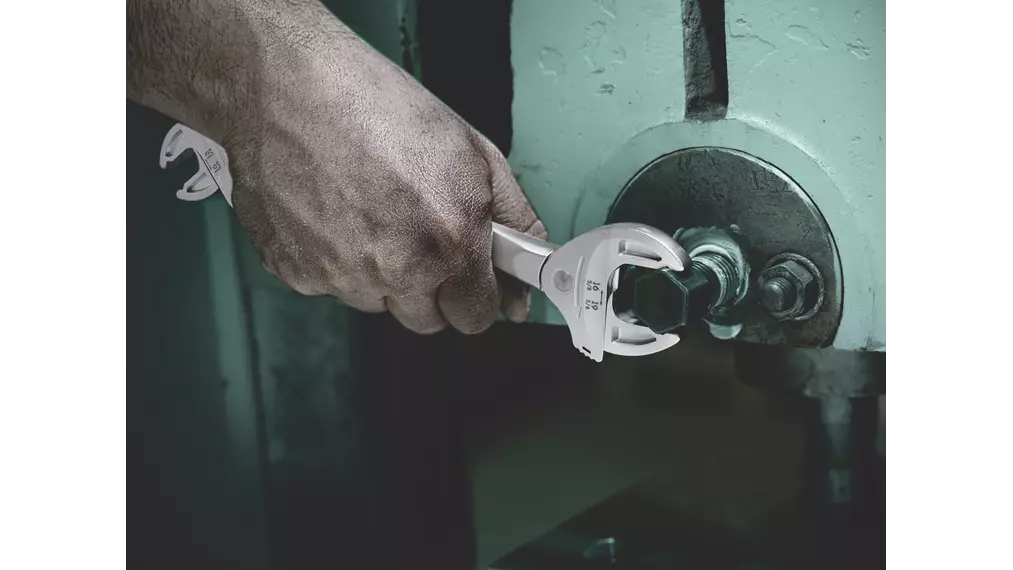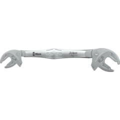 Llave de boca dobla autoajustante para cabezas de tornillos o tuercas hexagonales con tamaño de llave 13-16 y 16-13 (métricos) o 1/2"-5/8" y 5/8"-3/4" y 7/16"-8/16" (en pulgadas). Gracias a las mordazas de guía paralela y continua se sustituyen varios tamaños individuales de llaves de boca. La llave encuentra el tamaño necesario de manera autónoma al colocarse en la tuerca o el tornillo. El mecanismo de palanca integrado aprisiona el tornillo o la tuerca hexagonal de forma segura entre las mordazas lo cual reduce claramente el peligro de un resbalamiento y de los daños que esto puede producir. La función de carraca permite un trabajo de atornillar rápido y sin interrupciones. Gracias a la utilización de los ángulos prismáticos se puede realizar un ángulo de retorno de tan solo 30°. La función de carraca y el prisma angular permiten un buen trabajo incluso en espacios de montaje muy estrechos. La llave de doble boca ajustable Joker 6006 con función de carraca es la herramienta universal clásica. Autoajustante. Enérgica. Con carácter de carraca.