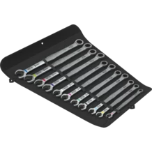 Un juego de llave carraca combinada de 11 piezas. Se trata de una combinación genial de extremo de boca y mecanismo de carraca en el extremo del anillo en una versión larga. Para cabezas de tornillos hexagonales o tuercas hexagonales. La palanca larga permite una mayor transmisión de la fuerza. La versión larga también sirve para un acceso más fácil en caso de uniones atornilladas que se encuentran a profundidad. Incluye una función de sujeción gracias a una placa metálica que se encuentra en la boca, que reduce el riesgo de que los tornillos o las tuercas se pierdan durante el trabajo. La placa metálica en la boca es intercambiable y dispone de unos dientes extraduros que sujetan los tornillos y las tuercas de forma segura, y que de esta manera reducen el peligro de un resbalamiento. El tope final integrado es capaz de evitar el deslizamiento de la cabeza del tornillo hacia abajo y permite la aplicación de altos pares de giro. La geometría de doble hexágono conlleva una conexión completa con la forma del tornillo o de la tuerca, y de esta manera se reduce el riesgo de un resbalamiento. El ángulo de retorno mínimo de tan solo 30° al lado de la boca evita que se le tenga que dar la vuelta a la llave al trabajar lo cual normalmente cuesta mucho tiempo. El mecanismo de carraca al lado del anillo dispone de un dentado fino extraordinariamente alto con 80 dientes para una mayor flexibilidad incluso en espacios de montaje muy estrechos. La geometría de forja especial permite la transmisión de altos pares de giro y una rigidez torsional alta. La herramienta está hecha de un acero de alto rendimiento de cromo-molibdeno con un recubrimiento de níquel-cromo para una excelente protección anticorrosiva. Lleva el sistema de búsqueda de herramientas Take it easy: con marcas a color según el tamaño, y además con unas indicaciones del tamaño grabadas a láser. En un bolso enrrollable robusto para un transporte fácil y un alojamiento seguro. Viene con dos lazos para colgar el bolso, tanto cuando está cerrado como cuando está abierto.
