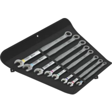 Un juego de llave carraca combinada de 8 piezas. Se trata de una combinación genial de extremo de boca y mecanismo de carraca en el extremo del anillo en una versión larga. Para cabezas de tornillos hexagonales o tuercas hexagonales. La palanca larga permite una mayor transmisión de la fuerza. La versión larga también sirve para un acceso más fácil en caso de uniones atornilladas que se encuentran a profundidad. Incluye una función de sujeción gracias a una placa metálica que se encuentra en la boca, que reduce el riesgo de que los tornillos o las tuercas se pierdan durante el trabajo. La placa metálica en la boca es intercambiable y dispone de unos dientes extraduros que sujetan los tornillos y las tuercas de forma segura, y que de esta manera reducen el peligro de un resbalamiento. El tope final integrado es capaz de evitar el deslizamiento de la cabeza del tornillo hacia abajo y permite la aplicación de altos pares de giro. La geometría de doble hexágono conlleva una conexión completa con la forma del tornillo o de la tuerca, y de esta manera se reduce el riesgo de un resbalamiento. El ángulo de retorno mínimo de tan solo 30° al lado de la boca evita que se le tenga que dar la vuelta a la llave al trabajar lo cual normalmente cuesta mucho tiempo. El mecanismo de carraca al lado del anillo dispone de un dentado fino extraordinariamente alto con 80 dientes para una mayor flexibilidad incluso en espacios de montaje muy estrechos. La geometría de forja especial permite la transmisión de altos pares de giro y una rigidez torsional alta. La herramienta está hecha de un acero de alto rendimiento de cromo-molibdeno con un recubrimiento de níquel-cromo para una excelente protección anticorrosiva. Lleva el sistema de búsqueda de herramientas Take it easy: con marcas a color según el tamaño, y además con unas indicaciones del tamaño grabadas a láser. En un bolso enrrollable robusto para un transporte fácil y un alojamiento seguro. Viene con dos lazos para colgar el bolso, tanto cuando está cerrado como cuando está abierto.