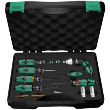 Juego de herramientas de 12 piezas para el montaje y desmontaje profesional de sistemas de control de la presión de neumáticos. Con una tecnología dinamométrica para el apriete controlado de los tornillos. Herramientas manuales con el mango multicomponente tipo Kraftform para altas velocidades de trabajo y, al mismo tiempo, una gran ergonomía. Cinco herramientas preajustadas para la conexión entre la tuerca racor con el tornillo, así como para atornillar el cuerpo de sensores con la válvula. Dos enroscadores de válvula preajustados von valores de entre 0,25 y 0,45 Nm. Un mango Kraftform tipo pistola ajustable para valores del par de giro entre 4,0 y 8,8 Nm. Esta herramienta es adecuada para todos los sistemas de control de presión de neumáticos conocidos. Un apriete seguro gracias a las marcas de color inequívocas de los valores del par de giro (Beru/Huf®: TX 10 amarillo 1,25 Nm ;Schrader®: TX 10 verde 1,4 Nm; Cup®/RTS®: TX 20 gris 2,0 Nm). El destornillador dinamométrico preajustado en el valor de 3,3 Nm acciona tanto la tuerca racor como el tornillo de conexión de los sensores del sistema Alligator. Además contiene: adaptador para vasos, dos puntas, contrasoporte de válvulas (para una utilización hasta 4,5 Nm).