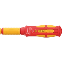 Mango de destornillador dinamométrico con aislamiento VDE con toma hexagonal de 9 mm; exclusivamente para varillas intercambiables Kraftform Kompakt VDE de Wera. Para trabjajos profesionales de atornillar y ajustes finos, y además para trabajos de atornillar con control dinamométrico. Una función dinamométrica con sobrerresbalamiento no sobrepasable para el apriete hacia la derecha y la izquierda. Con cinco pares de apriete elegibles derecha/izquierda (0,4; 0,8; 1,2; 1,6; 2,0 Nm) que se pueden ajustar de una manera extremamente rápida. Una posición fija (Torque Lock) para pares ilimitados de apriete y desapriete. Con manguito de marcha libre para una guía segura del útil durante el trabajo de atornillar.