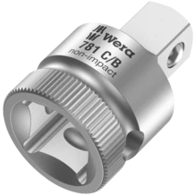 Adaptador de cuadrado interior de 1/2" a cuadrado exterior de 3/8". Para el manejo manual y a máquina (sin impacto), con retención de bola para el bloqueo seguro del vaso, moleteado en el extremo posterior para un alto agarre durante el manejo manual; cromo-vanadio, cromado mate.