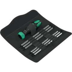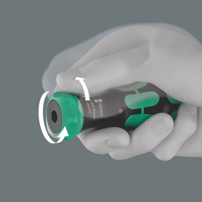 Porta-puntas manual Kraftform con toma hexagonal interior de 6 mm para varillas combinadas (varillas dobles) del programa Vario de Wera. La carraca que se encuentra integrada en el mango dispone de un dentado fino y permite un trabajo muy veloz. La conmutación del sentido de giro sucede de forma intuitiva: al girar el conmutador anular hacia la derecha, se atornilla en dirección hacia la derecha, y al girar el conmutador anular hacia la izquierda, se atornilla hacia la izquierda. Para realizar trabajos de precisión, el mecanismo de carraca puede desactivarse por medio de la posición 0. El mango Kraftform bicomponente con su combinación de zonas duras y blandas, permite un agarre fuerte y un trabjajo sumamente preciso.