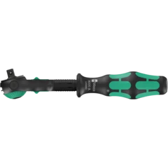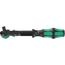 Carraca Zyklop con arrastre de 3/8". Una superficie de alta calidad y robusta, cromada en negro-mate. Gracias al dentado fino de 72 dientes se logra un ángulo de retorno mínimo de 5°. La cabeza de la carraca es libremente giratoria y se puede bloquear en cualquier posición con ayuda del conmutador que se encuentra a ambos lados del útil. Permite un trabajo fácil con gran libertad para la mano, incluso en situaciones de montaje muy estrechas. La fijación definida a 0°, 15° y 90° hacia la izquierda y la derecha, garantiza un trabajo seguro sin que la cabeza de la carraca se resbale. En la posición de 0°, la carraca - con el adaptador y la punta - se puede utilizar como un destornillador normal. La construcción de masa de inercia permite un aceleramiento del proceso de atornillar. La construcción de simetría rotacional del mango Kraftform y el manguito de marcha libre apoyan los movimiento de giro ultrarrápidos. Gracias a la forma del mango Kraftform que se adapta de manera excelente a la mano, se evitan lesiones en la mano del usuario, como la formación de ampollas y callosidades. Los materiales duros que se utilizan para el mango, garantizan un cambio de agarre veloz sin que exista el riesgo de que la piel del usuario se quede pegada en el mango. Las zonas más blandas y antideslizantes permiten una transmisión de las altas fuerzas sin pérdida alguna. La carraca es adecuada para llaves de vaso de cuadradillo de 3/8", así como para piezas de conexión con arrastre de cuadradillo de 3/8", con bloqueo por bola.
