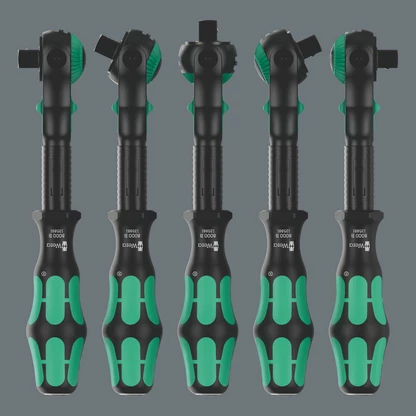 - Cabeza de carraca libremente giratoria, botón de bloqueo y conmutación de derecha e izquierda