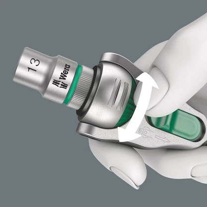 La cabeza de la carraca gira libremente y se puede bloquear en cualquier posición por medio de los pestillos deslizantes que se encuentran a ambos lados. Es posible realizar trabajos con gran libertad de manos sin problema alguno, incluso en situaciones de montaje muy estrechas o difícilmente accesibles. La fijación definida en 0°, 15° y 90° hacia la izquierda y la derecha, garantiza un trabajo seguro sin que se mueva la cabeza de la carraca.