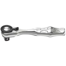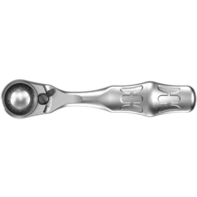 La mini-carraca de Wera "Zyklop Mini 3" sirve para vasos de ¼". El manejo es superfácil, incluso es posible accionarla con una sola mano en caso de que el espacio de montaje en uniones atornilladas sea muy estrecho. Se trata de una elaboración de acero forjado en estampa en el 100 %. El mecanismo del dentado es muy fino, cuenta con 60 dientes y proporciona así un ángulo de retorno de tan solo 6° lo que permite un trabajo sumamente preciso. La rueda moleteada permite un movimiento de giro muy rápido al atornillar en aquellos casos en los cuales el espacio es demasiado estrecho para realizar los movimientos de volteo con la carraca completa. La conmutación de izquierda a derecha es muy simple. La cabeza de la carraca y la palanca de conmutación tienen un diseño ergonómico.