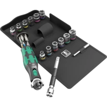Una combinación amplia pero compacta de carracas y destornilladores. Carraca Zyklop compacta con recámara de puntas para guardar en el bolsillo. Toma magnética directa para puntas de ¼" y vasos de 3/8". El cambio de la punta es sumamente rápido ya que la toma no se realiza con bloqueo. La cabeza es bloqueable a los ángulos 0°, 15° y 90°, así la herramienta es utilizable como carraca y destornillador carraca. El dentado fino con sus 72 dientes permite un ángulo de retorno de tan solo 5°. El espectro de uso es muy amplio, gracias a las 12 puntas que vienen integradas dentro del mango. El mecanismo robusto de la carraca entrega unos pares de giro totalmente suficientes. Es una combinación perfecta entre una carraca Zyklop y un juego de destornilladores de 12 piezas. El porta-puntas universal, con un largo de 75 mm para puntas de 1/4", se puede utilizar como prolongación. Incluye vasos en los tamaños más usuales. Viene en una caja de material textil; esta es adecuada para conectarla con el sistema de transporte Wera 2go.