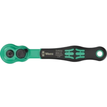 Carraca Zyklop Comfort con palanca de reenvío en el diseño de Wera irresistible, de 1/4". Una camisa bicomponente de material plástico sumamente cómoda. Protege las superficies delicadas ante daños. La forma de construcción es delgada lo cual permite un trabajo en espacios de montaje muy estrechos. Gracias al dentado fino con sus 80 dientes se consigue un ángulo de retorno muy pequeño de tan solo 4,5°. Lleva una palanca de reenvío para un cambio del sentido de giro muy cómodo. Integra una función de bloqueo seguro de los vasos por medio de un botón pulsador.