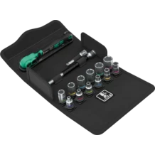 Juego de carraca de 15 piezas, de 1/4", llaves de vaso en tamaños métricos. 1 carraca Zyklop Comfort con palanca de reenvío, un dentado fino de 80 dientes, un ángulo de retorno pequeño de tan solo 4,5°; 12 llaves de vaso Zyklop con el sistema de búsqueda de herramientas Take it easy: unas marcas a color según el tamaño, y además con indicaciones del tamaño grabadas a láser, para encontrar la herramienta precisa de forma rápida; 1 prolongación Zyklop (de 150 mm) con manguito de giro rápido para un movimiento de giro superrápido, 1 prolongación "Wobble" con un ángulo de ladeo de 15° en todas las direcciones. 1 caja textil robusta diseñada de forma compacta para un alojamiento que ahorra espacio; el material de la caja, estable y ligero a la vez, reduce el peso del conjunto - perfecto para trabajos externos.