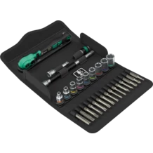 Juego de carraca de 28 piezas, de 1/4", llaves de vaso con tamaños en pulgadas. 1 carraca Zyklop Comfort con palanca de reenvío, un dentado fino de 80 dientes, un ángulo de retorno pequeño de tan solo 4,5°; 9 vasos Zyklop (tamaños en pulgadas) con el sistema de búsqueda de herramientas Take it easy: unas marcas a color según el tamaño, y además indicaciones del tamaño grabadas a láser, para encontrar la herramienta precisa de forma rápida; 1 prolongación Zyklop (de 150 mm) con manguito de giro rápido para un movimiento de giro superrápido, 1 prolongación "Wobble" con un ángulo de ladeo de 15° en todas las direcciones, 1 adaptador de puntas (de cuadradillo interior de 1/4" a hexágono interior de 1/4"), 15 puntas, resistentes y duras, para el uso universal. 1 caja textil robusta diseñada de forma compacta para un alojamiento que ahorra espacio; el material de la caja, estable y ligero a la vez, reduce el peso del conjunto - perfecto para trabajos externos.